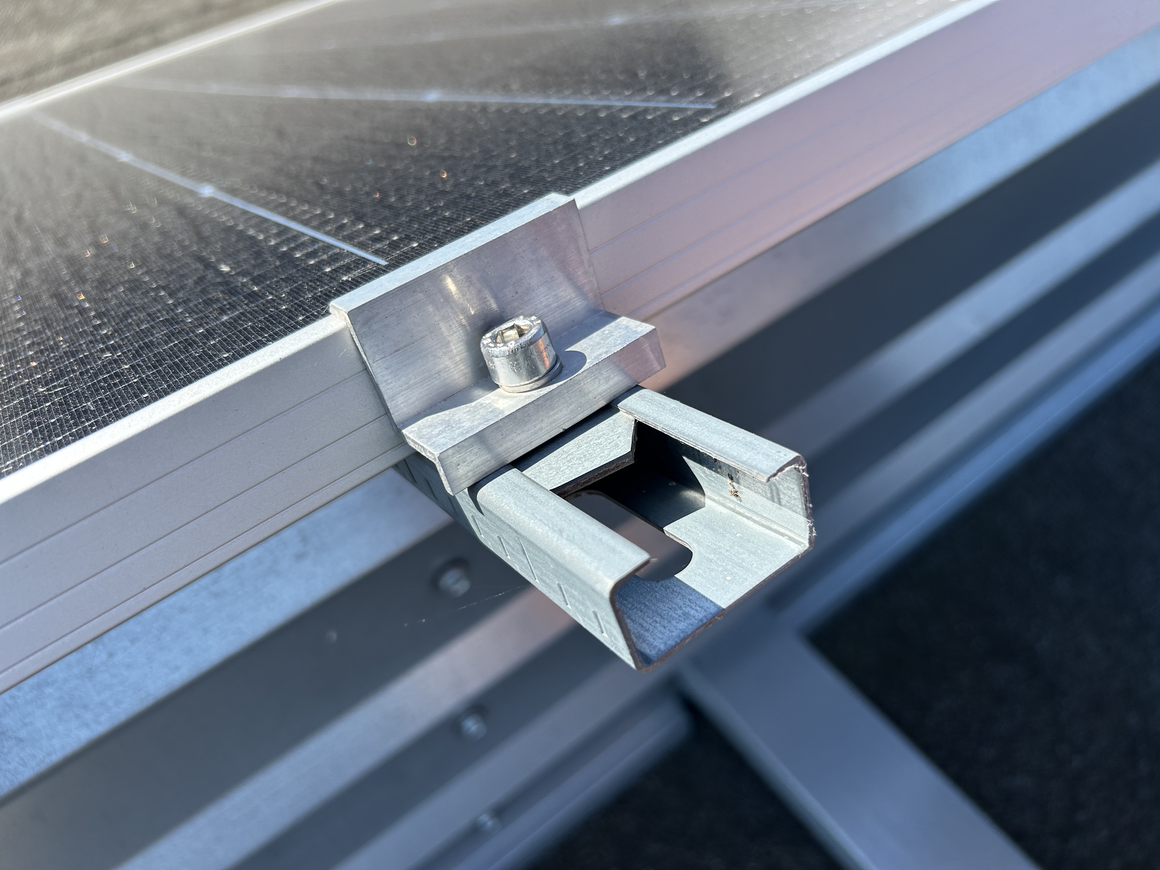 System montażu modułu PV: klema aluminiowa przykręcana do krokwi prostopadłej do dłuższego boku modułu PV